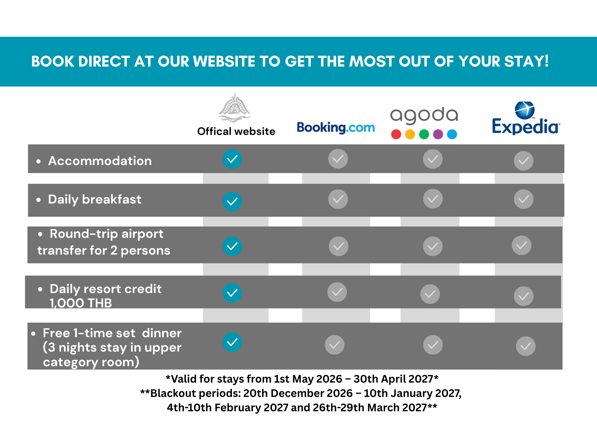 • The additional direct benefit is valid for stays from 1st May 2026 – 30th April 2027